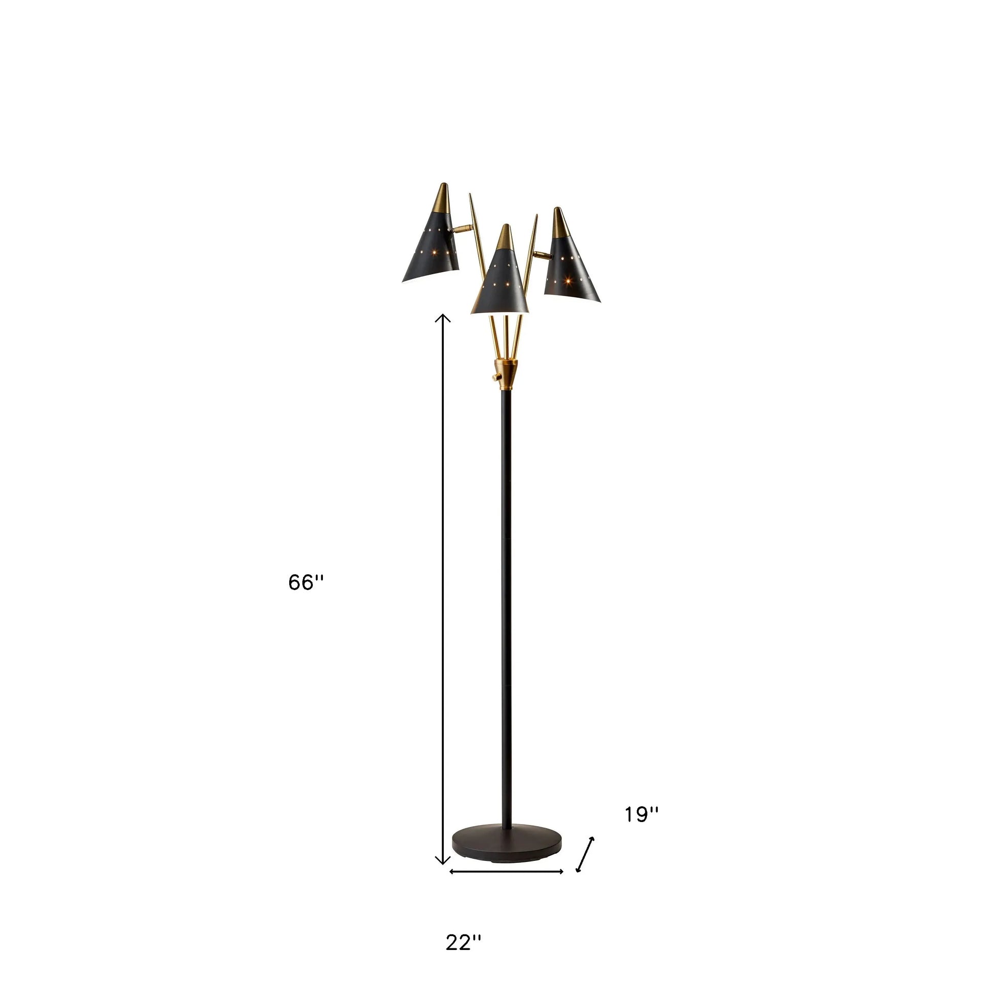 Bring of level of elegance and charm to your space with this good looking 66-inch black and gold metal three light novelty floor lamp with black metal cone shade. The base of this lamp is made of matte metal. The matte of this lamp creates a nice contrast with the black metal cone shaped shade. Designed to be unique and visually pleasing while giving great light, this novelty lamp will bring some fun fashion and style to your space high quality design makes this a great lamp for not only lighting, but accenting a room with style. The perfect lamp to create just the right natural and soothing light in your space. 66-inch h x 22-inch w x 19-inch d.